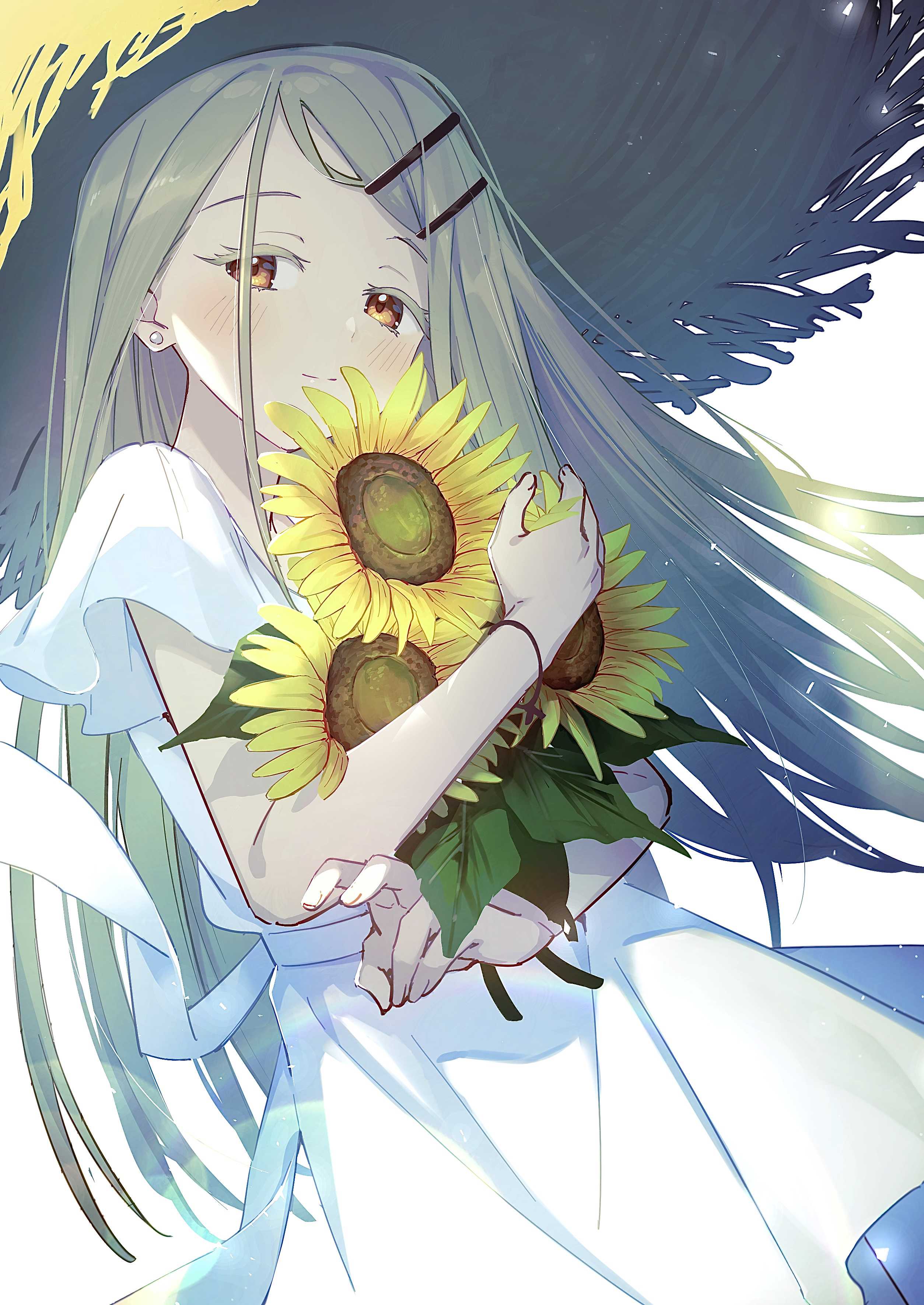 向日葵 草帽 白色连衣裙